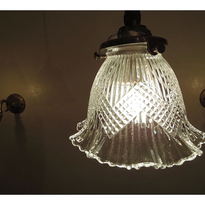 ガラスシェードと、横ネジ式のアンティーク色ツイスト灯具がセットになっています。