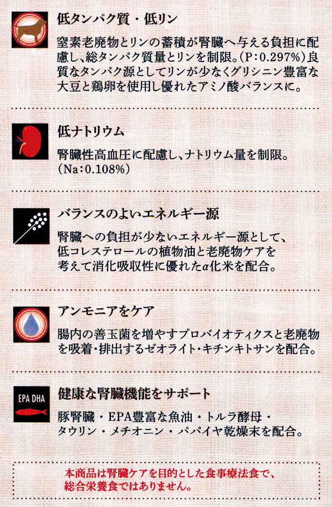 低タンパク質・低リン・低ナトリウム・エネルギー補給型の優れた栄養組成とした “腎臓ケア用食事療法食” ※本商品は腎臓ケアを目的として特別に栄養調整した食事療法食で、総合栄養食ではありません。