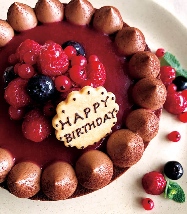 ■厳選したクーベルチュールチョコレートを使った 口溶けの良いチョコレートムース ■食べ応えのあるチョコスポンジ ■ナッツ入りで食感もアクセントのチョコクランチ生地 3種類の異なるチョコレート素材に、サワーチェリーを隠し味にした優しい酸味の苺ムースがベストマッチ! 真っ赤なベリーのジュレやトップに飾ったフルーツがアクセントになって、しっかり濃いチョコレート味なのに最後まで食べ飽きない美味しさでです。