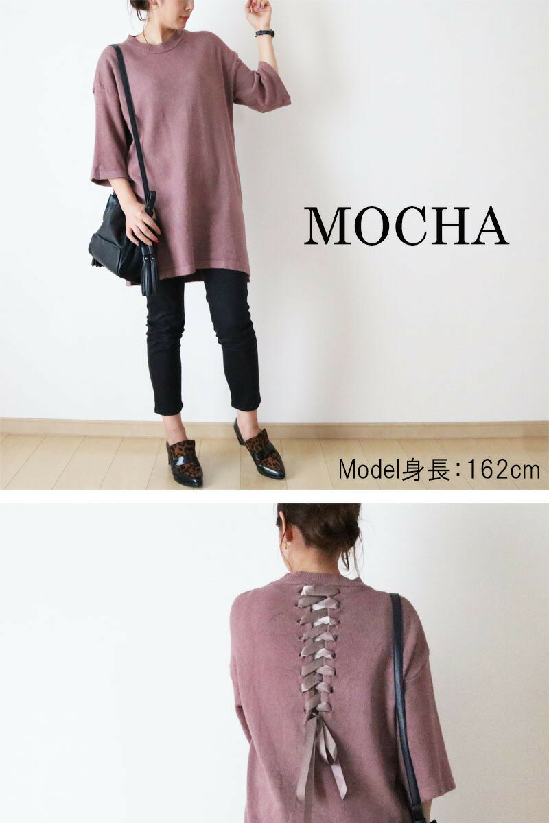 15%OFFクーポン配布中!【送料無料】ニットワンピース ロング ニット レディース トップス チュニック リボン レースアップ クルーネック 七分袖 長袖 無地 スリット 秋冬 ブラック モカ ピンク 大きいサイズ 後姿が可愛い♪